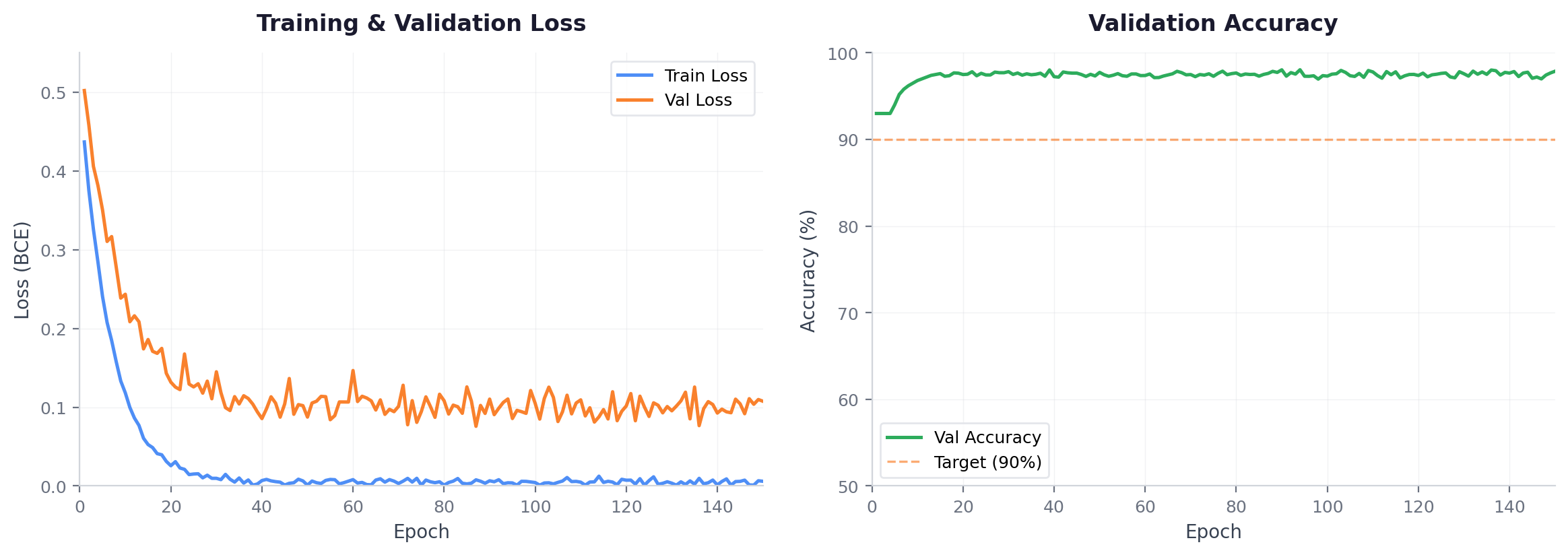 I initially planned around 50 epochs but decided to push it to 150 to see what would happen. The model converged rapidly. By epoch 15, validation accuracy was already above 97%. The remaining 135 epochs showed essentially no improvement, with train loss near zero and validation loss plateaued around 0.12, showing mild overfitting but excellent generalization.
